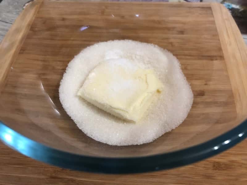 - До розм’якшеного вершкового масла додаємо цукор, ванілін, дрібку солі і збиваємо міксером пару хвилин до пишної маси.