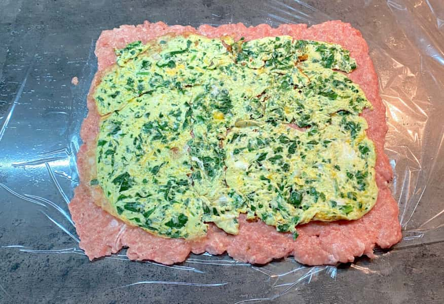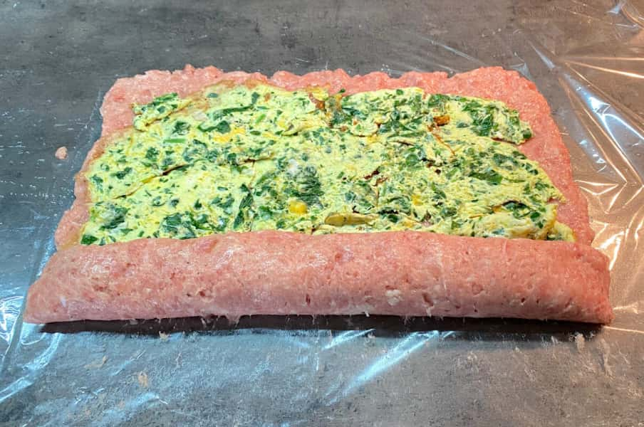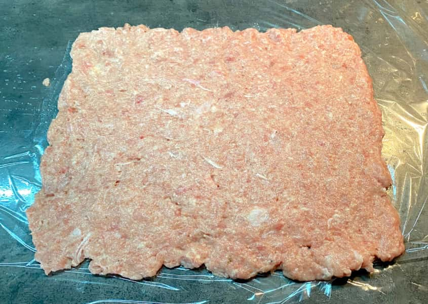 Рукав для запікання розрізала та розклала на робочу поверхню, трохи змастила олією. Виклала фарш та розрівняла лопаткою так, як показано на фото.