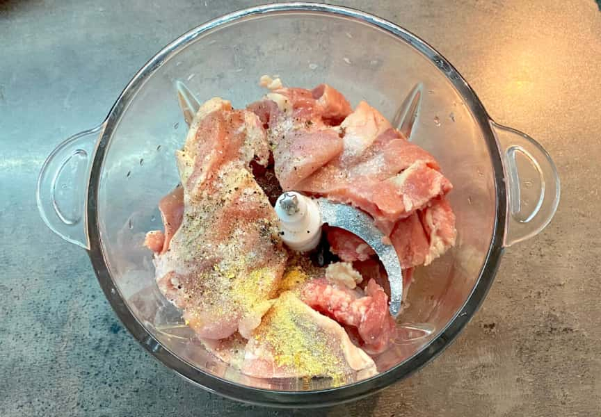 Отже, філе стегна виклала у подрібнювач, додала сушений часник, перець та сіль. Подрібнила до однорідної маси.