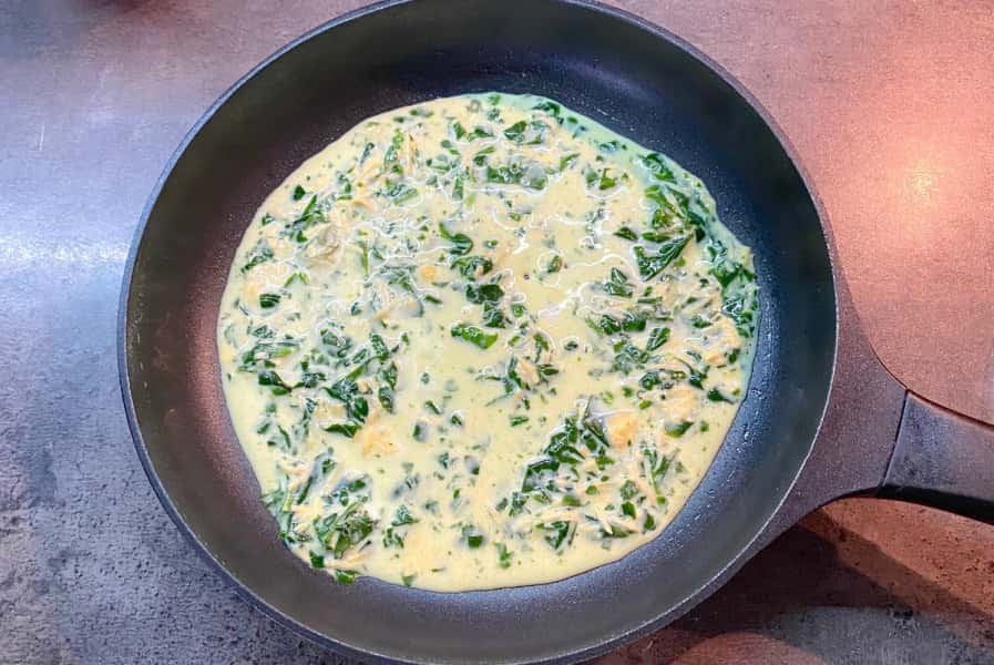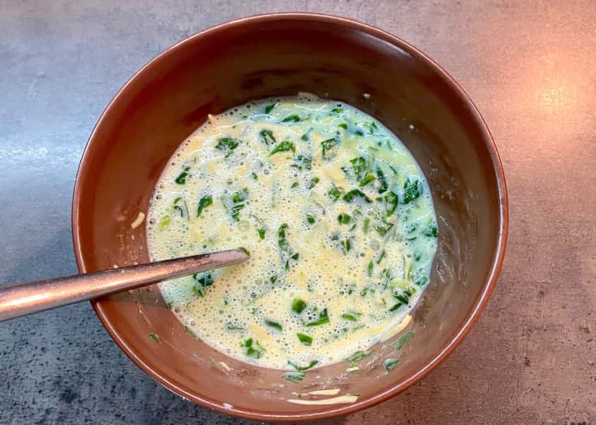 У миску вбила яйця, влила вершки (або молоко), додала тертий сир та нарізаний шпинат, трохи посолила та перемішала.