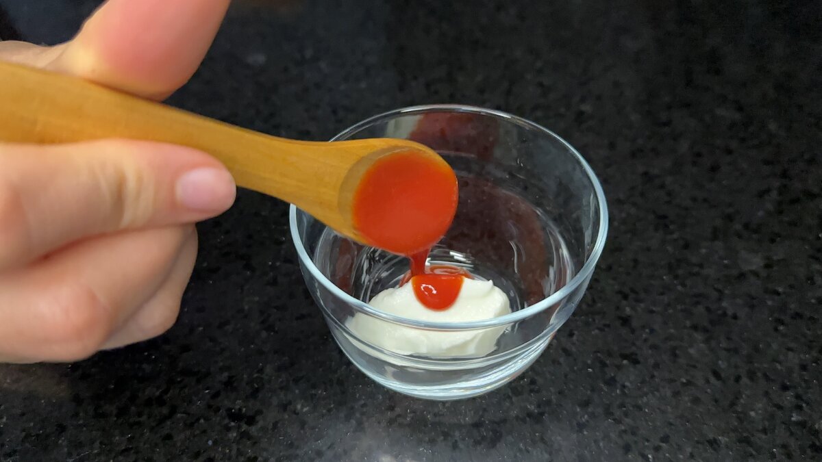 У чашу кладемо по 1 ч. Л. сметани, томатної пасти і перемішуємо.