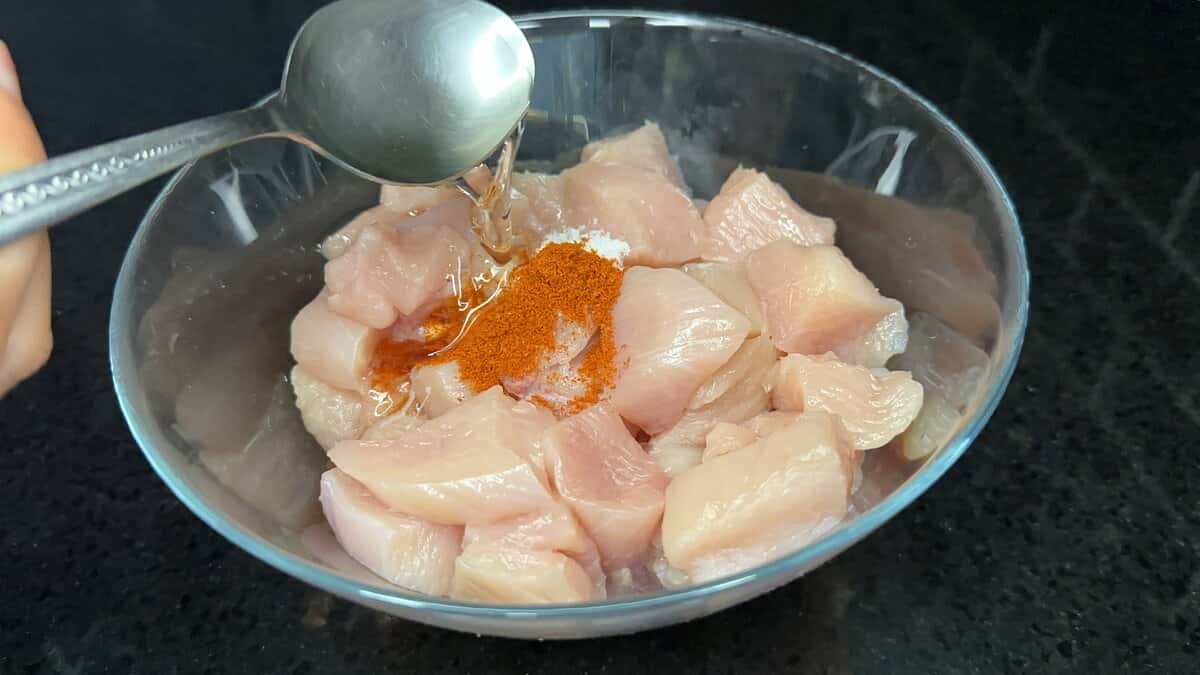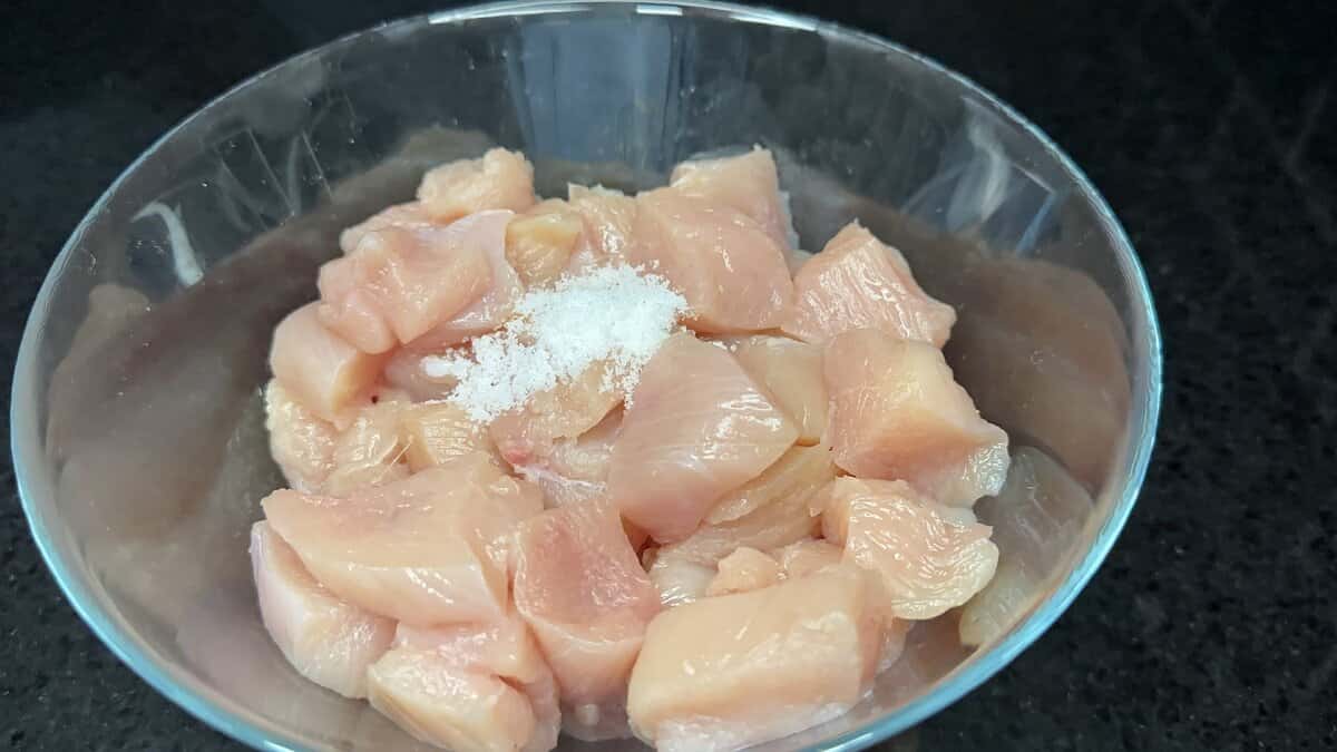 Спочатку готуємо загальний маринад. Потрібно взяти 900 гр. курячої грудки, порізати її шматочками.