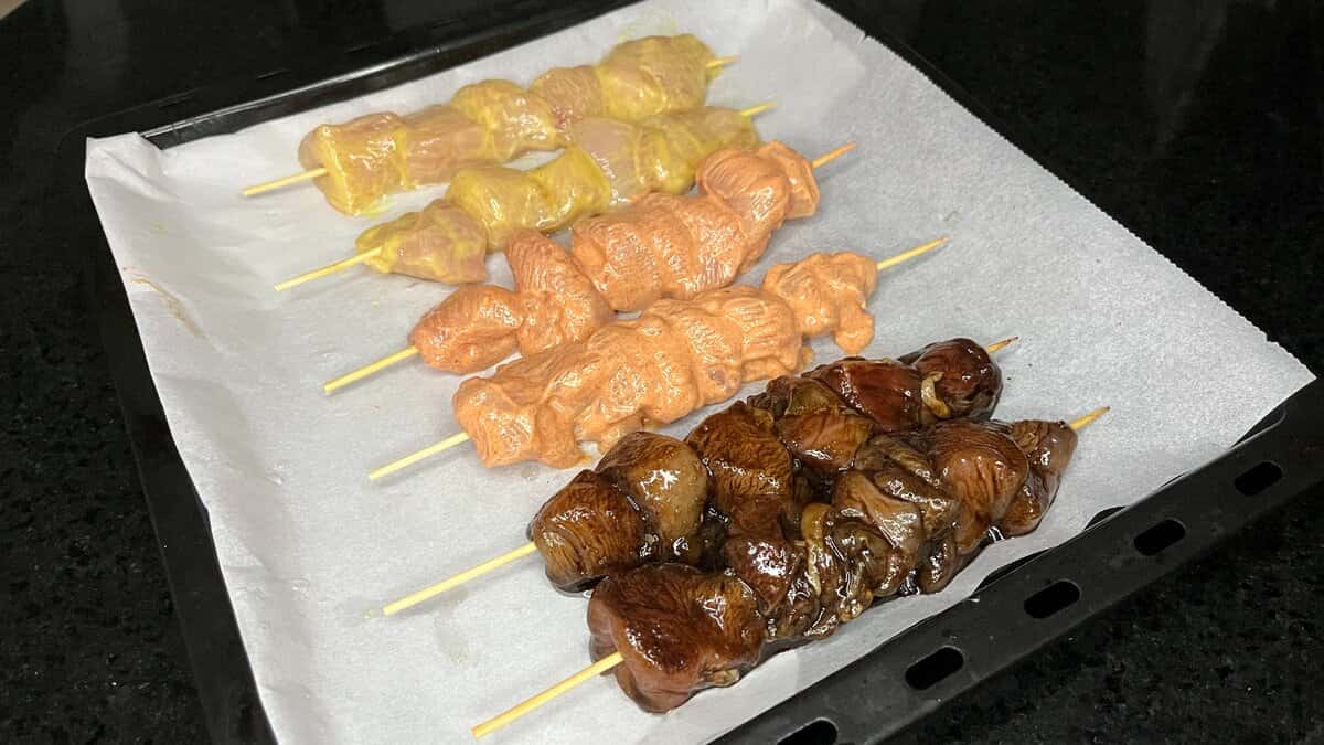 Далі кожну з трьох частин м’яса змащуємо підготовленими маринадами. Потім шматочки м’яса насаджуємо на дерев’яні шпажки.