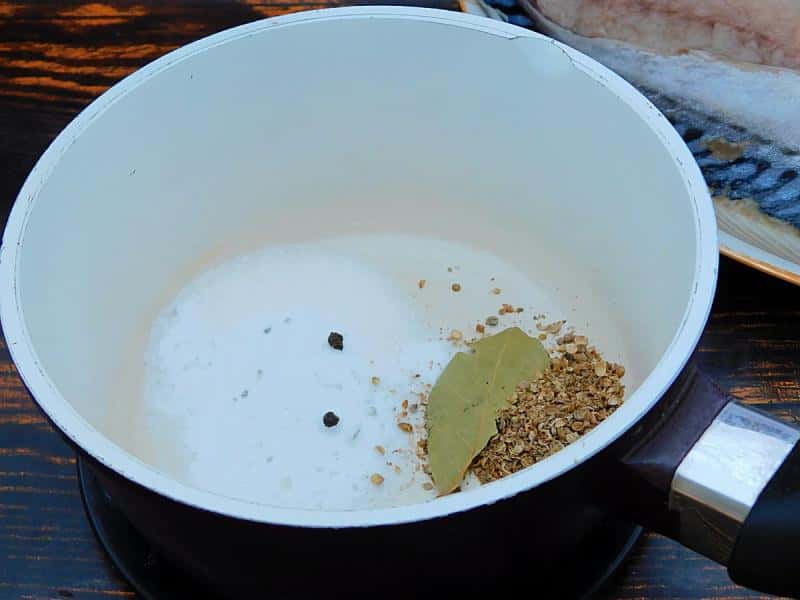 Для розсолу в каструлю всипати сіль та цукор. Насіння коріандру розтерти у ступці, щоб вони стали ароматнішими. Також покласти лавровий лист та горошини перцю.