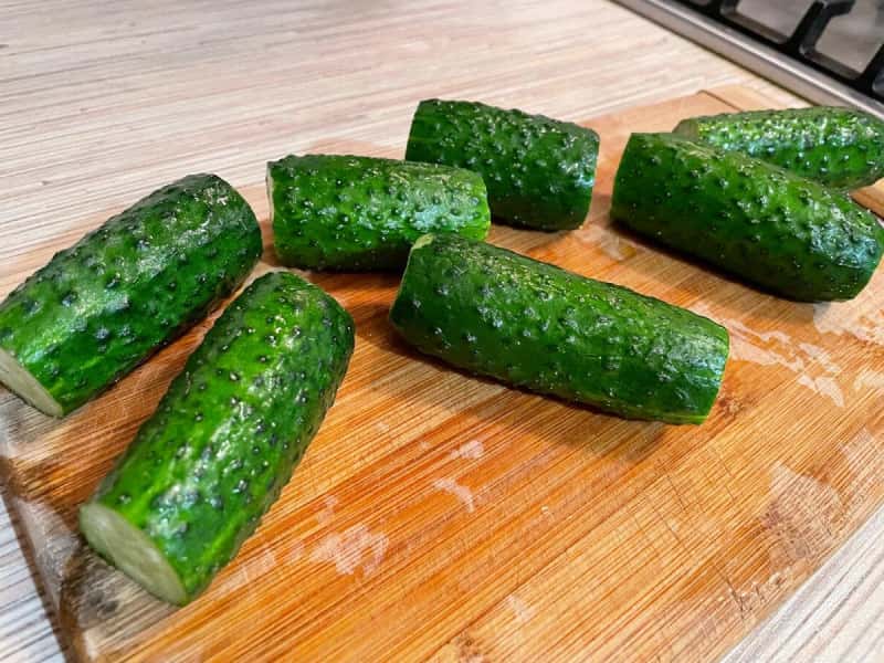 Огірки ретельно промиваємо під проточною холодною водою, відрізаємо кінчики. Злегка обсушуємо паперовими рушниками.