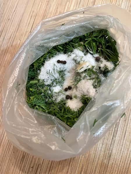 Крок 5. У пакет до огірків додаємо нарізані кріп і часник, сіль, цукор і перець.