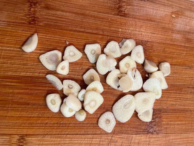 Крок 4. Часник очищаємо, а потім нарізаємо. Я вважаю за краще різати часник крупно, щоб його було легко прибрати. Якщо ви любите часник, то можете нарізати його дрібно.