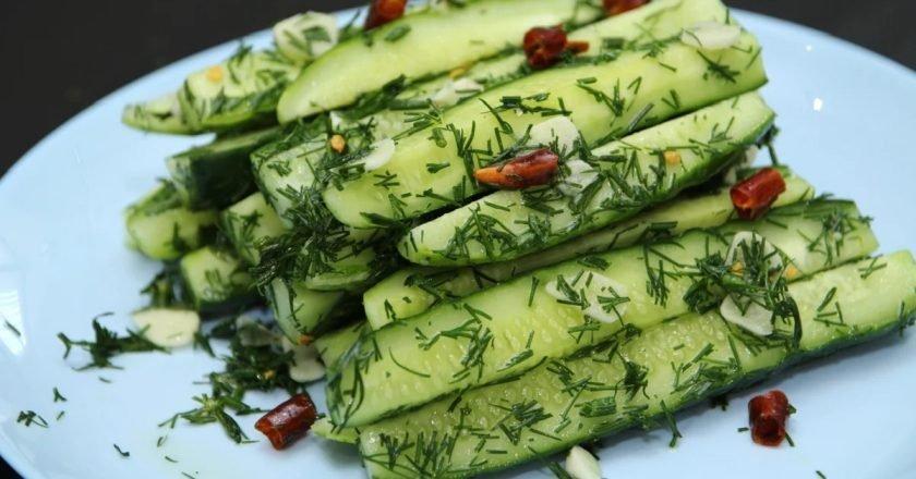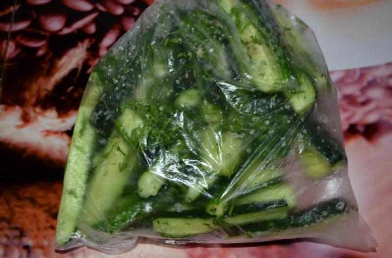 Помістіть огірки в пакет, додайте решту інгредієнтів і зав’яжіть. Тепер добре стряхніть його і залиште в холодильнику на 15 хвилин. Готово! Якщо хочете насиченіший смак, можна залишити закуску в холодильнику на дві години.