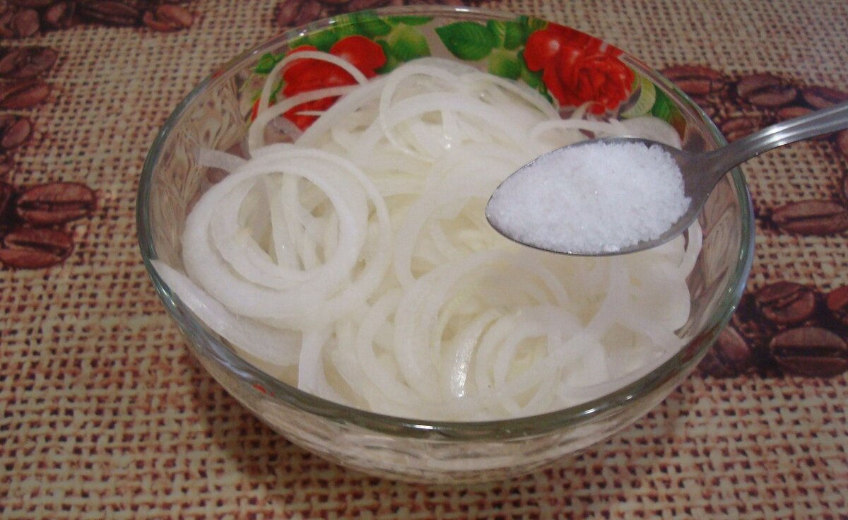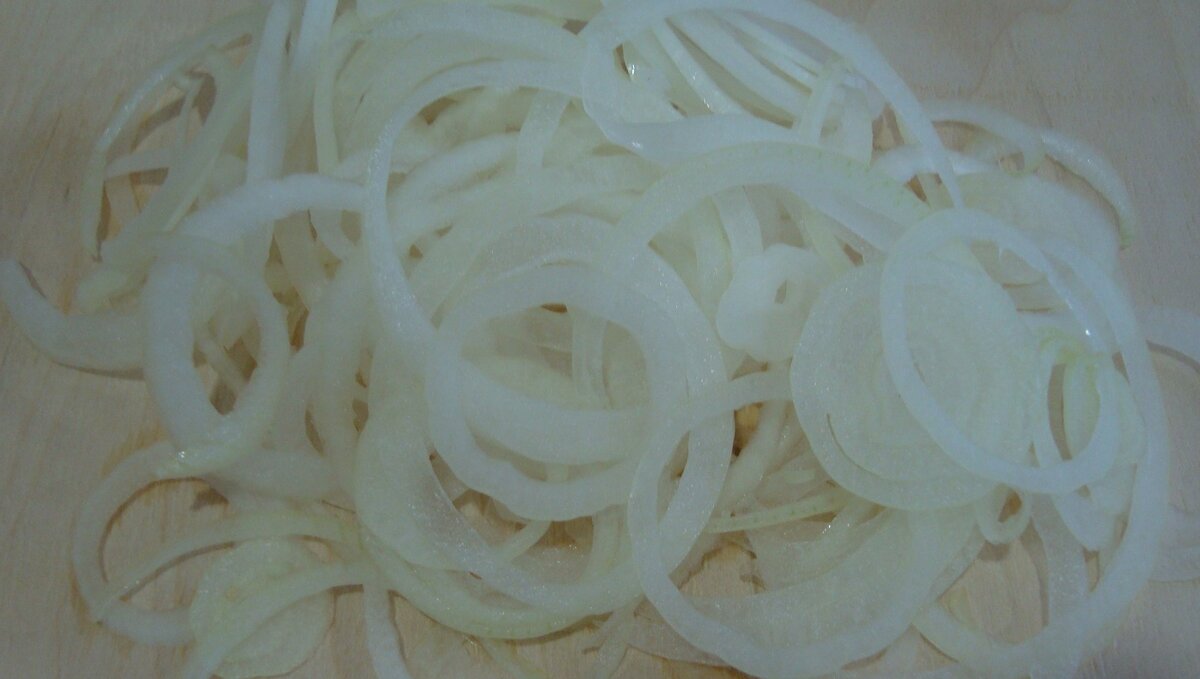 Цибулю ріпчасту очищаю, мию, нарізаю тоненькими кільцями.