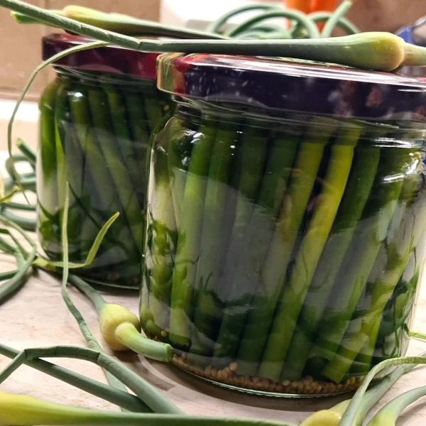 Цього року без часникових стрілок також не обійшлося. Часникову пасту зробили, часникове песто приготували (про нього пізніше 😉), ну і завершальним етапом мариновані часникові стрілки.