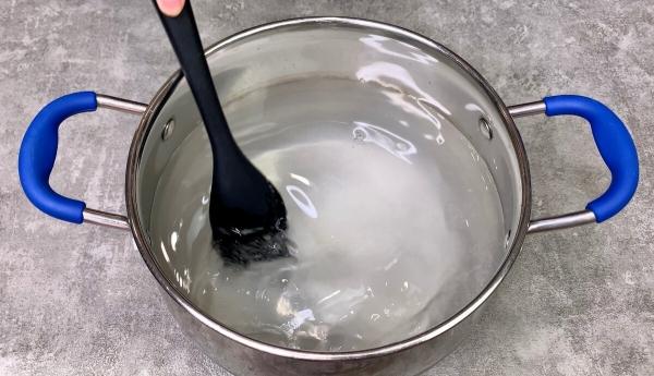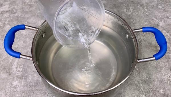 4. У каструлю з водою всипаємо сіль, цукор, ставимо на вогонь, доводимо до кипіння, вливаємо 9% оцет, помішуємо і знімаємо з вогню.