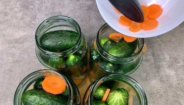 3. Набиваємо банку огірками, а зверху розкладаємо моркву.