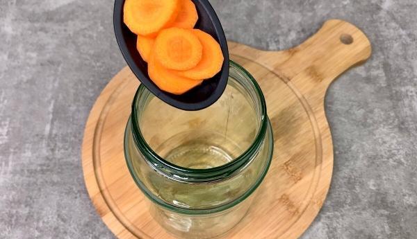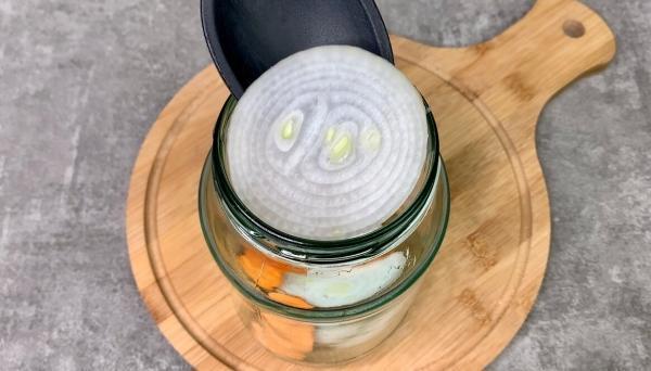 2. На дно чистої банки укладаємо кружечки свіжої моркви і кілька пластин цибулі. Також закладаємо лавровий лист, запашний перець і гвоздику.