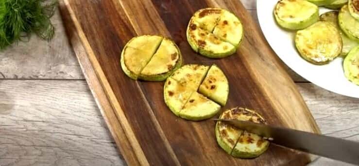 - Тепер кабачок нарізаємо на 4 частини та відправляємо у відповідну миску.