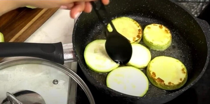 - Беремо сковороду, обсмажуємо кабачки до золотистого кольору з обох боків.