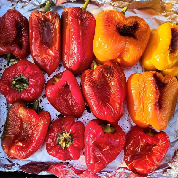 Солодкий перець помити та обсушити. Кожну перчину вмочити в олію (я змащую з усіх боків кулірнарним пензликом) і укласти на застелений фольгою або папером лист.