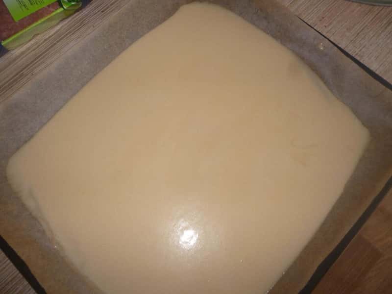 Деко застилаємо змащеним папером для випічки. Виливаємо тісто на деко шаром близько 1 см.