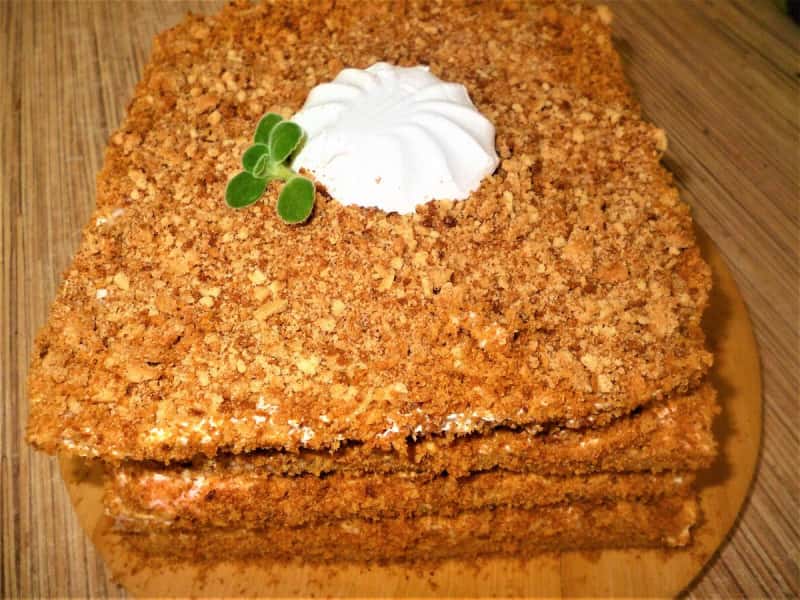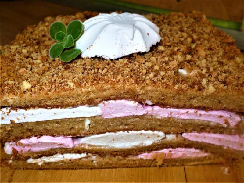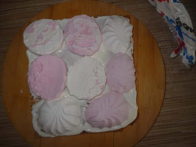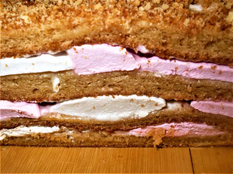 Коржі в цьому торті не розгортаються, тісто наливається на лист. І навіть крем не потрібно збивати. За смаком торт нагадує бісквітний з медовим ароматом, а підталий в сметані зефір нагадує ніжне кремове суфле. Дуже смачно!