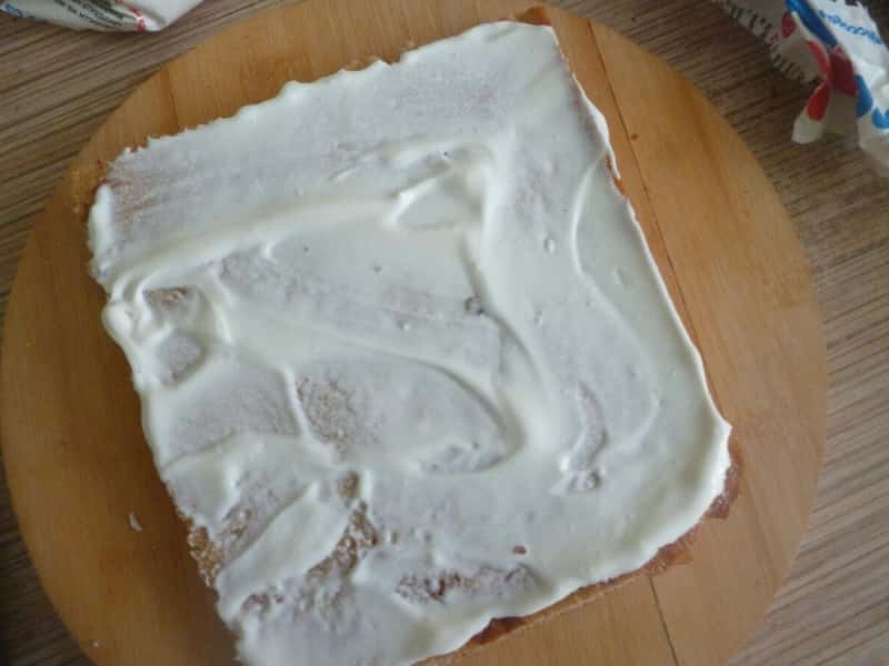 Обрізаємо нерівні краї і ділимо корж на 4 частини.