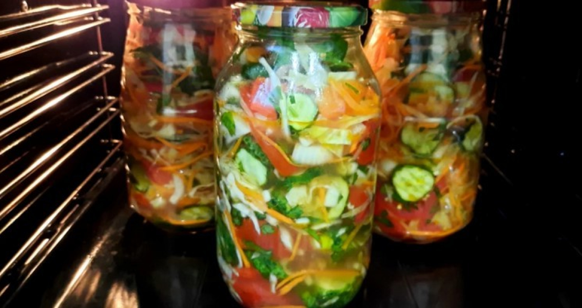 6. Після цього розкладаємо салат по банках, заливаємо в банки що виділився сік від овочів і відправляємо стерилізуватися в духовку на 35 хвилин при температурі 170 градусів. Прошу звернути увагу, що банки потрібно ставити в холодну духовку, інакше в гарячій вони можуть лопнути.
