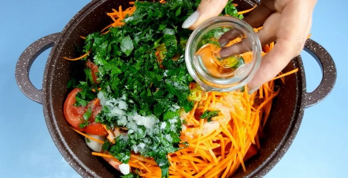 5. Потім додаємо сіль, цукор, 250 мл води, 250 мл соняшникової олії, 70% оцтову есенцію, все ретельно перемішуємо і залишаємо настоюватися на 3 години.