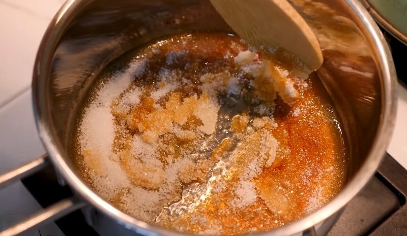 - Спочатку приготуємо карамель. Ставимо сотейник на невеликий вогонь і всипаємо в нього 100 г цукру. Не забуваймо постійно помішувати. Робимо це доти, доки кристали не розчиняться повністю.