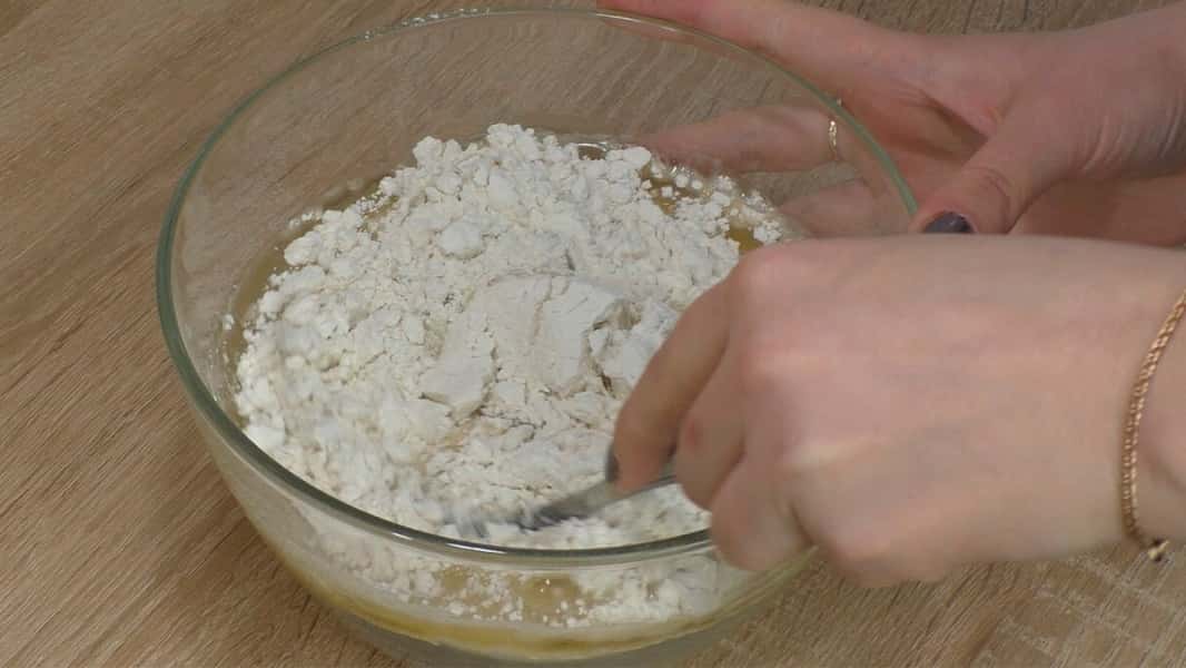 Тепер виливаємо цей сік в просіяне борошно, сюди ж відправляємо олію і розпушувач. Починаємо вимішувати тісто до отримання однорідної маси.