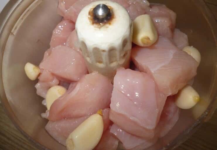 - У блендері або процесорі подрібнюємо філе курячої грудки разом із часником. Щоб краще подрібнювалося, можна додати відразу трохи молока із загальної кількості.
