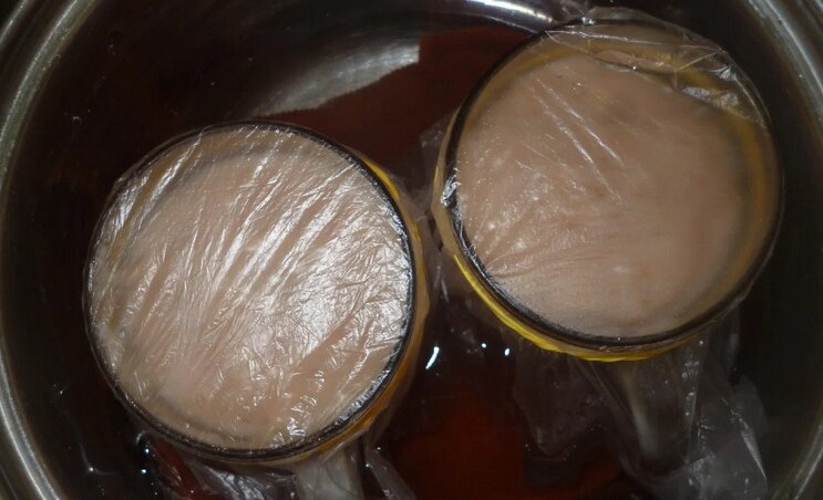 - На дно каструлі укладаємо серветку, ставимо кухлі, наливаємо воду трохи вище половини кружки.