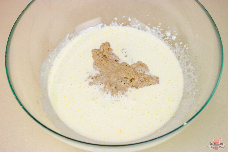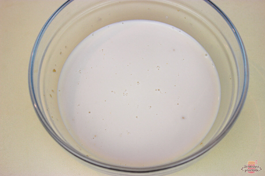 У чаші змішати тепле молоко та сухі дріжджі, перемішати та залишити до повного розчинення дріжджів. Якщо не впевнені в дріжджах, залиште дріжджову суміш хвилин на 15, рідина покриється бульбашками, отже, дріжджі хороші.