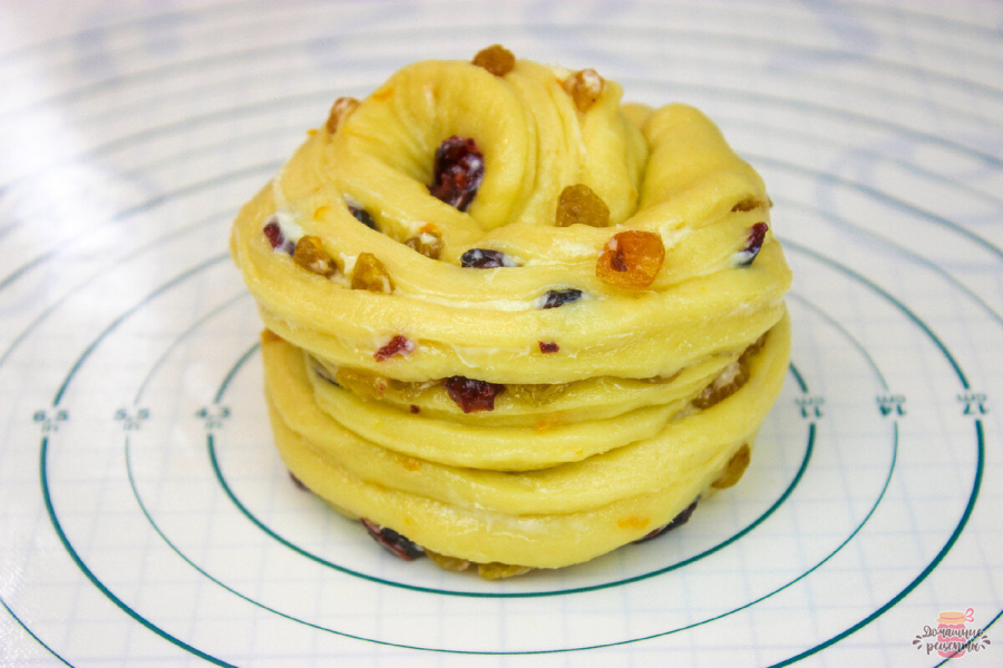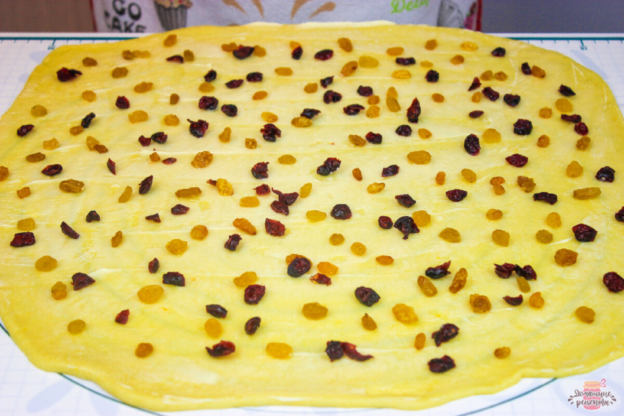 Тісто розкотити в тонкий пласт до 2 мм, змастити тісто м’яким вершковим маслом, посипати родзинками та журавлиною (попередньо родзинки та журавлину промити і обсушити паперовим рушником).