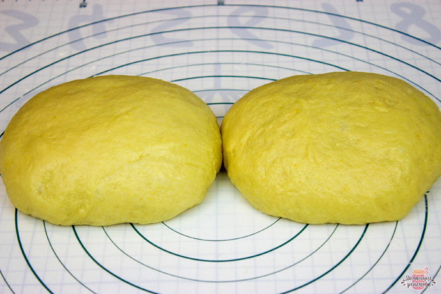 Тісто, що підійшло, розділити на 2 або (4) рівні частини, залежно від розміру форм. Потім підкатати в кулю, накрити плівкою і залишити хвилин на 5.
