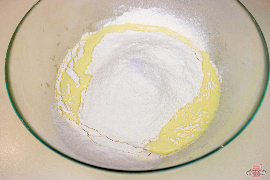 До рідких інгредієнтів просіяти борошно і додати щіпку солі, замісити тісто. Вимішувати тісто 10-15 хвилин, тісто буде однорідне і трохи липнути до рук.