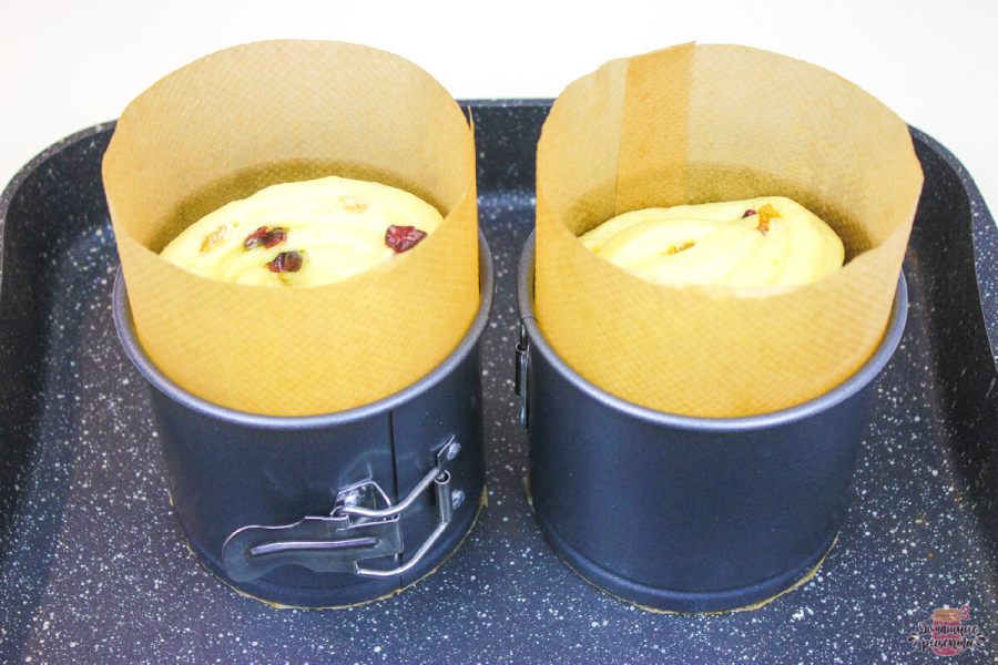 Дно форми застелити пергаментним папером, збільшити висоту форм пергаментним папером до 15 см.. Перекласти паски акуратно в підготовлені форми. Накрити плівкою і залишити на вистоювання приблизно на 1 годину, щоб паски добре збільшилися в об’ємі.