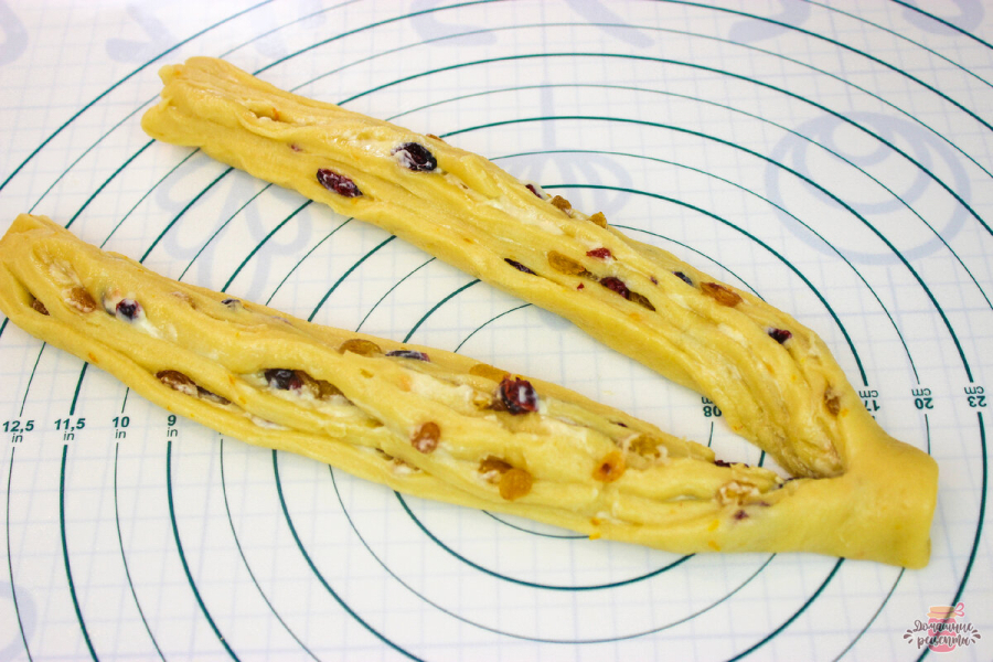 Тісто загорнути у щільний рулет. Рулет акуратно розрізати навпіл у довжину.
