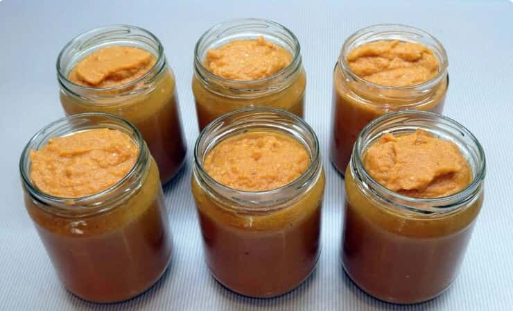 - Готову кабачково-баклажанну ікру розкладаємо по стерилізованих баночках і відразу ж герметично закатуємо стерилізованими кришками.