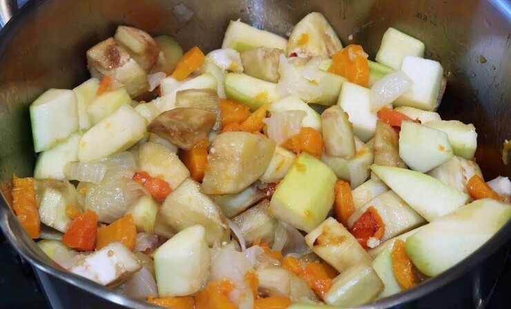 - Накриваємо кришкою і тушкуємо після закипання ще 30 хвилин на повільному вогні, періодично помішуючи. За цей час овочі дадуть сік і трохи зменшаться у розмірі.