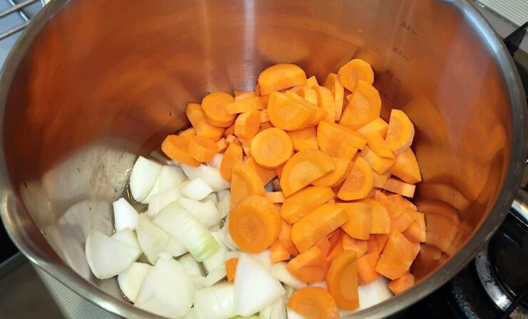 - У велику каструлю, де готуватиметься наша кабачкова ікра, вливаємо всю олію і додаємо ріпчасту цибулю та моркву.