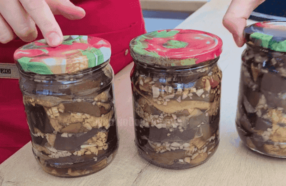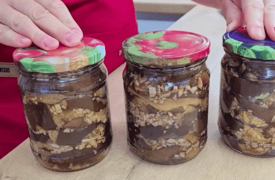 13. Закручуємо заготовки з баклажанів щільно кришками, перевертаємо і потрясемо, щоб розподілити цукор і оцет всередині. Також перевіряємо герметичність кришок.