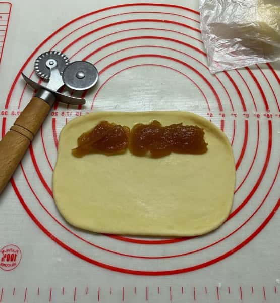 - Далі розкотити тісто у прямокутний пласт по краю викласти повидло ~3 ч. л. защипнути.