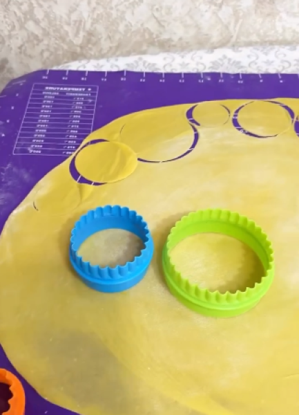 Ділимо на 2 частини. Розкачуємо тонко, як тільки можна. Вирізаємо кола: три кола різного діаметра.