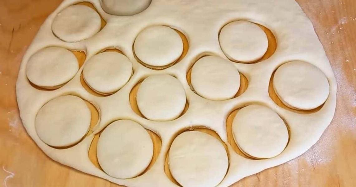 Скачуємо тісто в плоске коло і склянкою вирізаємо кружечки. Або ріжемо на квадратики.