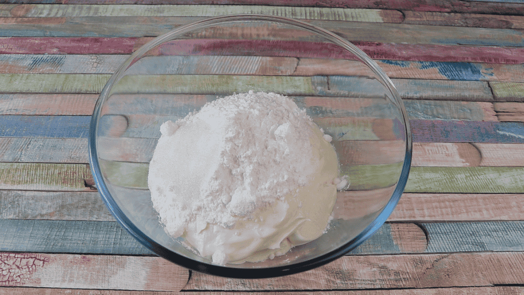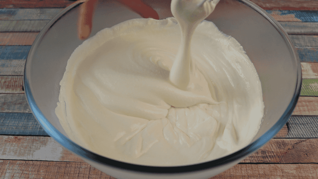 Для крему в миску кладемо 700 г жирної сметани (25 або 30%), додаємо 180 г цукрової пудри і 1 п (10 г) ванільного цукру. Крем перемішуємо вінчиком.