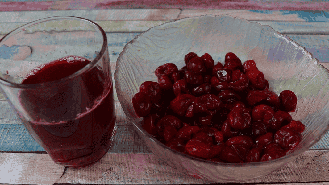 400 г вишні попередньо розморожуємо. Видаляємо кісточки. Зливаємо в стакан 150 мл соку, якщо не вистачає доливаємо води. Для торта підійде також консервована або свіжа вишня.