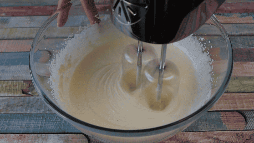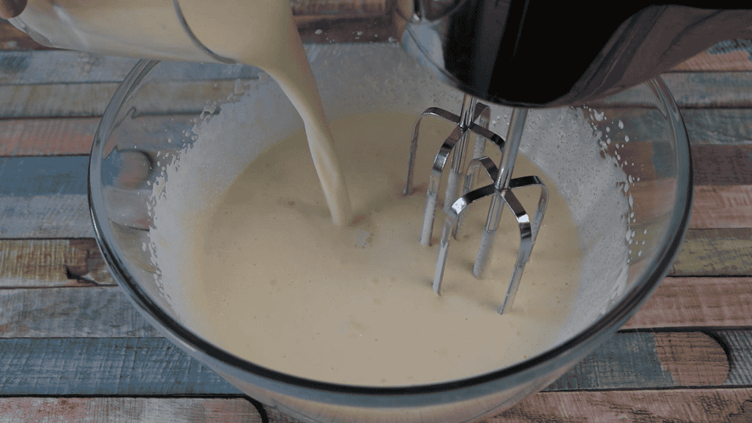 Окремо в миску розбиваємо 2 середніх яйця, додаємо 220 г цукру і 10 г ванільного цукру. Продукти збиваємо міксером ~ 4 хвилини до пишної світлої маси. Далі вливаємо 150 мл молока, 50 мл олії. Перемішуємо до однорідності. У два заходи додаємо сухі інгредієнти. Обов’язково просіюємо їх через сито. Замішуємо тісто міксером на низьких оборотах.