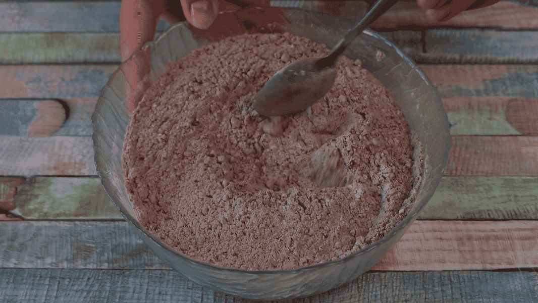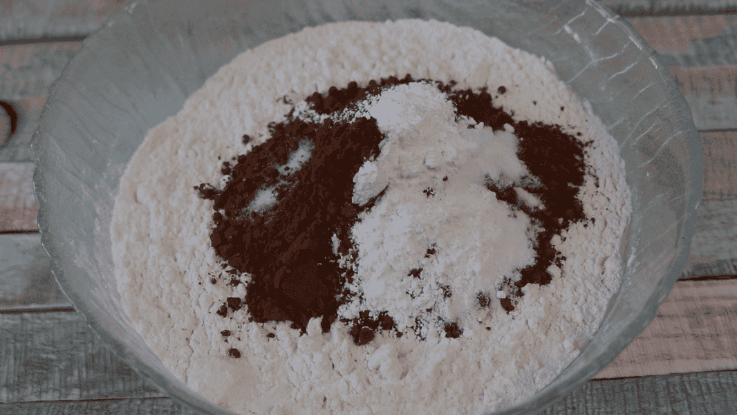 Для початку підготуємо сухі інгредієнти. До 200 г борошна додаємо 3 ст. л. какао (30 грам), дрібку солі, 1 ч. л. соди, 1 ч. л. розпушувача. Продукти перемішуємо.