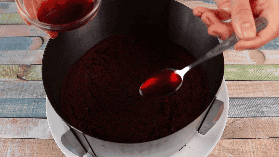 Збираємо торт. Тарілку змащуємо крапелькою крему, щоб торт не рухався. Викладаємо перший корж. За бажанням встановлюємо роз’ємне кільце. Також за бажанням, просочуємо коржі вишневим соком. Викладаємо крем. Візуально ділимо його на 3 частини + 3 ст. л. крему відкладаємо для обмазки боків. Потім викладаємо начинку. Візуально поділи її на 2 частини. Чергуємо шари коржів, крему і начинки. Останній корж просто змащуємо кремом.