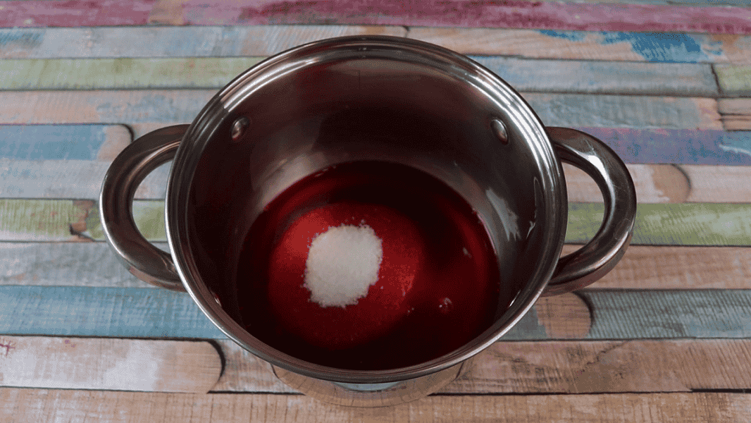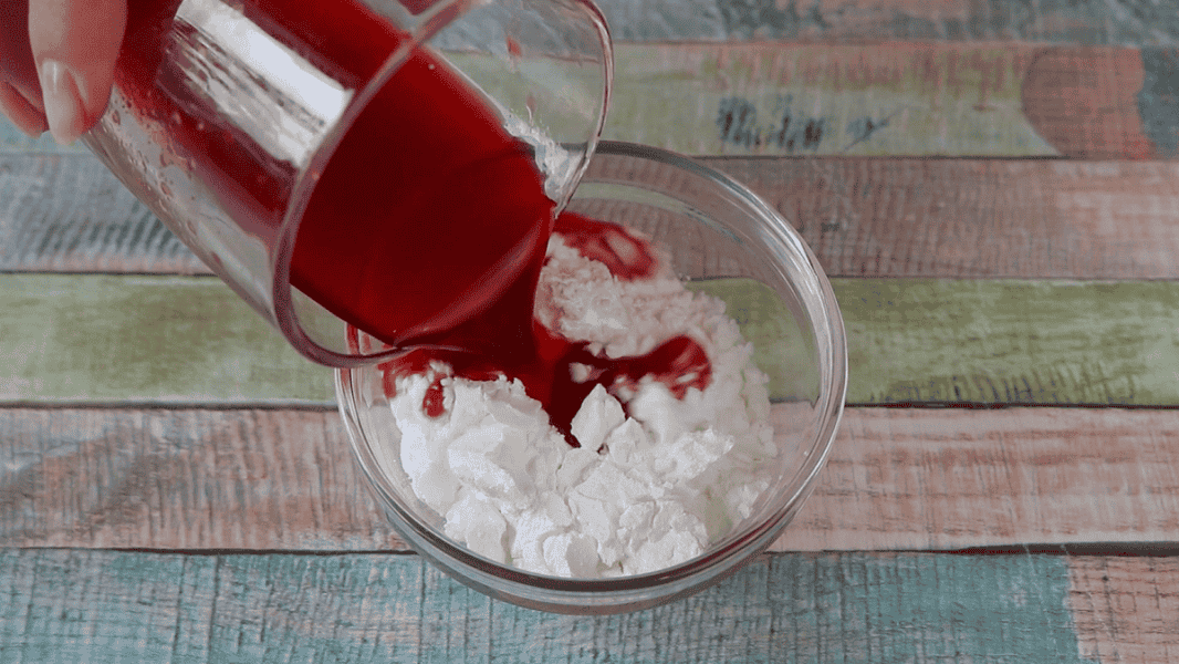 120 мл соку виливаємо в каструлю. Додаємо 80 г цукру. Перемішуємо. Решта 30 мл соку виливаємо в 30 г крохмалю. Знову перемішуємо до розчинення грудочок.