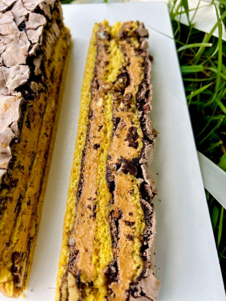 Пляцок складається з пісочних коржів, білково-шоколадної меренги, в середині шоколад і горіхи, я додала ще арахісу жменьку. Перемащений масляний кремом зі згущеним молоком. Це один з найсмачніших.