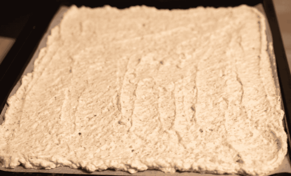 - Розігрійте духовку до 180 * С. Вистеліть на деко пергамент (44х38 см). Зверху розподіліть тісто максимально рівномірно, і випікайте 20 хвилин. Дайте охолонути.